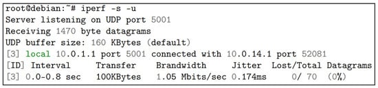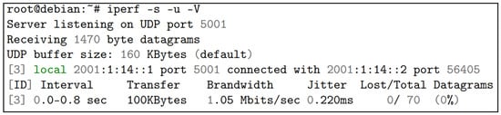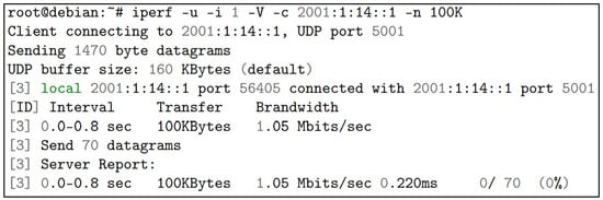 With the scenario in the IPv6 network protocol, the tests were performed following the same model that was used in IPv4, only changing the iperf parameters, which, in PC14, were iperf -u -s -V, with -u to use the UDP protocol, -s to assume server mode, and -V to use in IPv6 mode. In PC0, the parameters used were iperf -u -i 1 -V -c 2001:1:14::1 -n 100K -b 10G, -u to use the UDP protocol, -i 1 to determine the time of 1 s to display the output report, -V for use in IPv6 mode, 2001:1:14::1 being the IP of the server that received the requests, -n 100K to determine the number of bytes for transmission, and -b 10G for determining the 10G band, as shown in Figure 5.