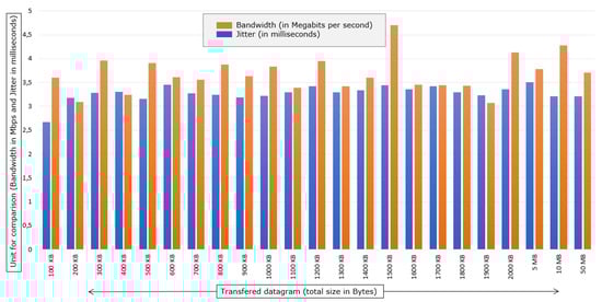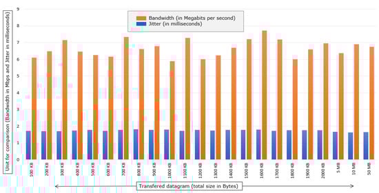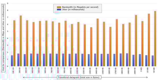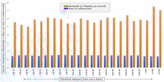 In Figure 9, it is possible to observe the relationship of the bandwidth and jitter of the tests performed in the IPv6 scenario with the fragmented MTU. A smaller bandwidth and a relatively higher jitter are noted than the previous scene.