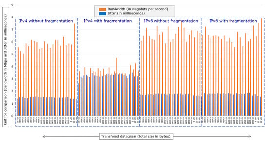 In Figure 11, it is possible to observe the relationship between the IPv4 and IPv6 scenarios with the standard and fragmented MTU, divided by the red frames. The values point to a stabilization in bandwidth and jitter when Path MTU Discovery is used.
