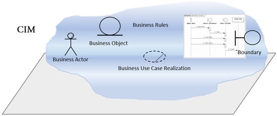At the CIM level are discovered and modeled Business Actors, Business UC Realizations, Business Objects and Business Scenarios, according to the Rational Unified Process. A Business UC Realization is a sequence of actions defining the interactions between a Business Object and a (software) system to achieve a goal. Business Objects represent real world business entities at a higher level of abstraction than software objects. Business Objects model organizational concepts, such as and Business Actors. Each Business Actor performs a set of Business UC Realizations in the enterprise context. Each Business UC Realization captures an elementary aspect of the system. For every Business UC Realization the main scenario is described; all deviations to such a scenario are described as alternative scenarios. Next to the Business UC Realizations, that capture the desired behavior, the Business Objects model provides a structural view of the software system. Business scenarios model the interaction between the behavioral and the structural aspects: each scenario is modeled with Sequence diagrams that contain the Business Actors, the Boundary classes and the Business Objects.