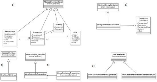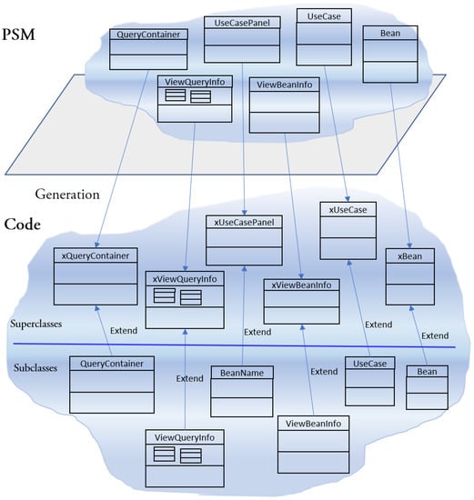 Once the design of the PSM artefacts is completed, xGenerator generates the source code of the Web Application and the deployment unit. It is possible to request either the generation of the code of a Java project in the Eclipse environment or to invoke the generation of the code and the deployable unit on the cloud. As mentioned, the code is generated according to the specifications of the extended MVC software architecture (Appendix A). In accordance with what is proposed in Reference [24], the classes are generated at two different levels of abstraction (Figure 7): for each class of the PSM, the superclass and the subclass are generated.