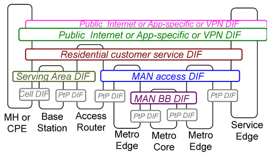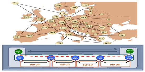 - Vrijders, S.; Staessens, D.; Colle, D.; Salvestrini, F.; Grasa, E.; Tarzan, M.; Bergesio, L. Prototyping the Recursive Internet Architecture: The IRATI project approach. IEEE Netw. 2014, 28, 20–25. [Google Scholar] [CrossRef]