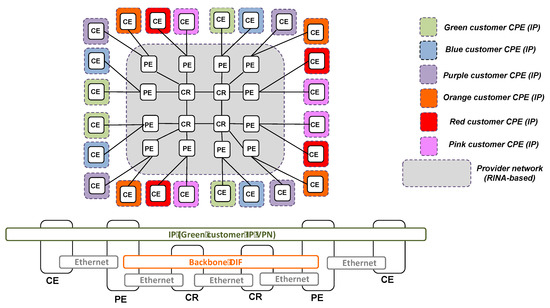 - De Leon, M.P.; Ranganathan, R.; Bainbridge, D.; Ramanarayanan, K.; Corston-Petrie, A.; Fundacio, E.G. Multi-Operator IPC VPN Slices: Applying RINA to Overlay Networking. In Proceedings of the RINA Workshop 2019, Colocated with ICIN 2019, Paris, France, 19–21 February 2019. [Google Scholar]