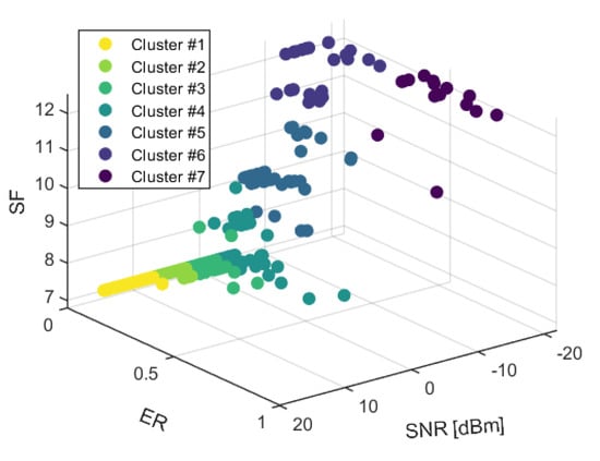 Figure 3 shows the seven resulting clusters for the considered dataset: the 3D plot is related to the ER, SF and SNR fields. Each cluster is represented by a different color (reported in the figure legend).