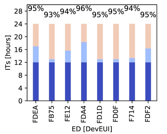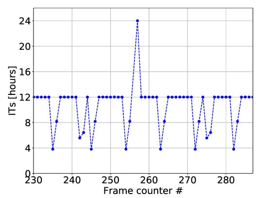 Figure 4 shows the ITs of roughly 60 packets of a single ED (the x-axis shows the FCnt of each packet). It is easy to recognize a pattern: many ITs lie at 720 min (which will be further called “part 1”), while some of them are less frequent and lie at 480 min, and others at 240 min (these latter two will be further called “part 2”). Different EDs show a similar behaviour: they share the same pattern structure and the same value for the first part, while the second part has other values that always sum up to 12 h. The combination of part 1 and part 2 represents the regular part of the transmission pattern. Figure 4 also shows a case where a packet has not been received by the network server. As a matter of fact we have in the figure a value at and another value at equal to 24 h, indicating that the packet at 12 h with has not been received.
