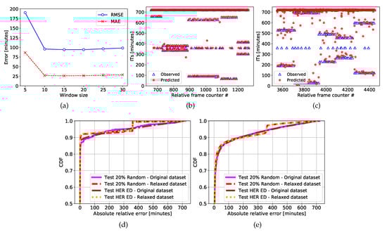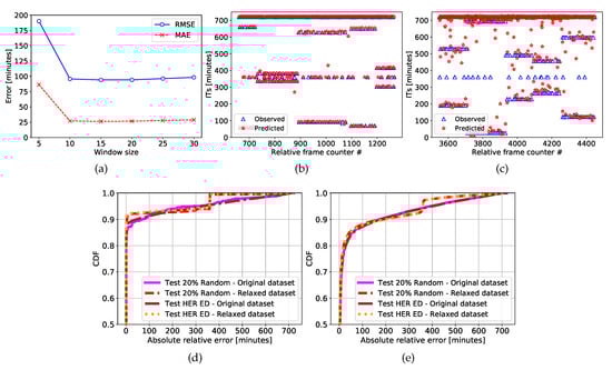 Further, Figure 8d,e show the Cumulative Distribution Function (CDF) of the absolute relative errors in terms of minutes for the four different combinations of original and relaxed dataset, tested on 20% LER and on HER. For the DT, 90% of errors are lower than 100 min, whereas for LSTM this value is reduced to 85%. Figure 8d also shows that in case of relaxed dataset, for the DT, 90% of errors are lower than 10 min.