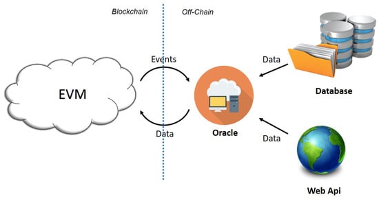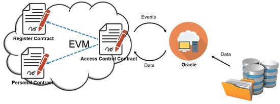 A blockchain diagram of the proposed scheme, where an Ethereum Virtual Machine (EVM) is connecting with an Oracle.