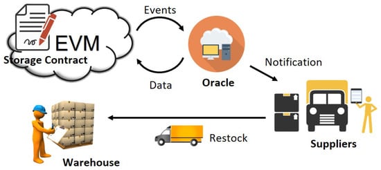 In this section, we first demonstrate how the proposed mechanism works in our application scenario 1: the automation of a stock management system (AoSMS). Since all the data and records are stored on the blockchain, tampering or modifying them is prevented. Also, the whole process can be viewed as being executing by a trusted black-box. As shown in Figure 2, there are five entities involved in this application including: the user (which is a customer), the service provider (which is a logistics company), the oracle (which has the escrow behavior), suppliers and nodes (which maintain the operation of the blockchain).