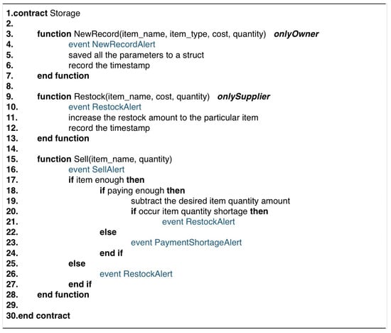 In our system, the Oracle acts like an escrow. It receives the contract requests when the codes, given in Figure 3, read the events that are highlighted in lines 4, 16, 21, 23 and 26. We now explain the processes among some logistics companies’ stocking process in detail.