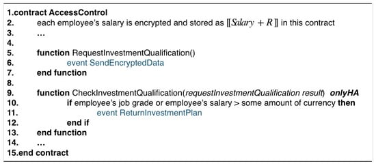 What does the above-mentioned on-chain privacy mean? Let us first consider the following situation: if the logic or function of a contract depends on some data that are so sensitive that they have to be protected, but at the same time, we want to leverage the benefits of blockchain technology, what should we do? Recall that the blockchain is a distributed public ledger, that is, the on-chain data are expected to be publicly accessible; therefore, it is infeasible to encrypt the data or the logic function directly, because we cannot verify the result from nodes that do not have the decrypt key. What if we had a way to test the truthfulness of the encrypted logic condition? Consider the following example shown in Figure 5.