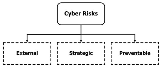 The ability to identify and manage cybersecurity risks in a timely manner is vital for the success and survival of any organization. All staff members need to be involved in cybersecurity risk management to be able to properly identify and assess risks [], which have to be categorized and prioritized. There are multiple ways to categorize cyber-risks, depending on their nature and potential ways to manage them. Figure 1 shows a hierarchy of cybersecurity risks.