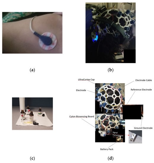 Procedure for Data Collection, (a) EMG, (b) Auditory sound presentation, (c) olfactory sniff strip preparation, (d) Ultracortex EEG cap setup.