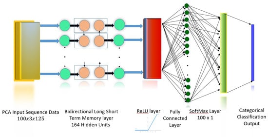 where xt is the input at time t, and ct and ht are the cell state and hidden state, respectively. W and b denote weights and biases, respectively. σ is the sigmoid function, and ° is the Hadamard product operator. dct is a candidate for updating ct through the input gate. The input gate it decides whether to update the cell state ct, while the forget gate ft decides what to keep and what to forget from the previous cell state, and output gate decides on how much information is passed to the next cell []. The BLSTM model used in this work is shown in Figure 3. The input to the network is the three principal component features obtained from the Principal Component Analysis (PCA) transformation of the 16 channel EEG/EMG signal. The BLSTM layer consists of one forward and one backward layer of a Long Short-Term Memory (LSTM) network, with a total of 164 hidden units (nodes). This layer learns bidirectional long-term dependencies between time intervals of the data. These dependencies are useful as the data collected from experiments pertaining to sensory motor functions are continuous, and the network learns the complete time series at each interval. A Rectifying Linear Unit (ReLu) Layer, defined as y = max(0,x), serves as an activation layer that outputs the original input if the input is positive, and outputs 0 if the input is negative. This function does not saturate (network values reach an asymptote and stagnate within a range), and the difference between successive weights is always high whenever a neuron activates. This permits the network to converge to the accurate value in a shorter period of time. The next layer is a fully connected layer where all nodes are connected to every other node. This layer is used to label inputs. The softmax layer limits the output of the function to a 0–1 range, to be interpreted as a probability. These probabilities are then mapped to a categorical label or symbol by the classification layer. The categorical or classification label is an integer value assigned to each class, which represents the set of five sensory motor functions, which serve as classes in which the input feature matrices are classified.
