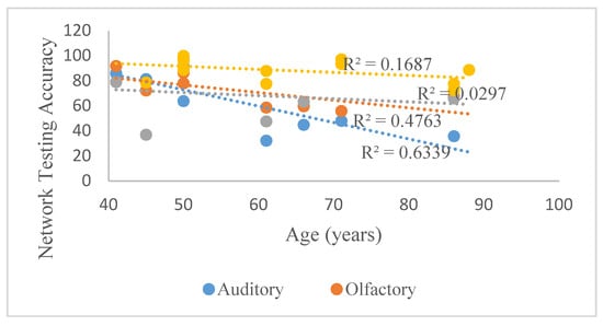 The BLSTM classification accuracy of evoked signals determines the extent to which the brain discriminates and processes the stimulus presented. Table 1 shows the discriminability of evoked responses to sensory motor stimuli (auditory, olfactory, motor imagery, and movement) as defined by network classification accuracy (%) of evoked signals for test groups studied. These results were obtained through intra-subject training and testing (data pertaining to the same subject were used for both training and testing). Table 2 shows the mean inter-subject (data pertaining to more than one subject used for both training and testing) classification accuracies of combined sensory motor potentials per age group. Table 1 and Table 2 suggests that the classification accuracy of the evoked potentials pertaining to all sensory motor stimuli peaks at age range 40–60 and declines thereafter, as demonstrated by responses elicited by auditory stimuli, right motor imagery, and two of the four olfactory stimuli utilized (neem and rosewater). This result is consistent with previous studies [,], concluding that key sensory motor functions such as audition, olfaction and gait peak in one’s 40’s or 50’s, resulting in deficiencies that are evident in one’s 60’s. According to Figure 4, which illustrates the aforementioned trends beginning at 40, the classification accuracy of auditory responses best reflected this trend, with an R2-value of 0.63. In contrast, Figure 5 indicates that the mean classification accuracy of potentials related to movement and motor imagery increases as a function of age. However, Figure 6 shows that when the left and right sides are considered separately, movement- and motor imagery-related stimuli are reliable indicators of age-induced and pathological cognitive deterioration, with the exception of right-hand movement and olfactory (lavender).