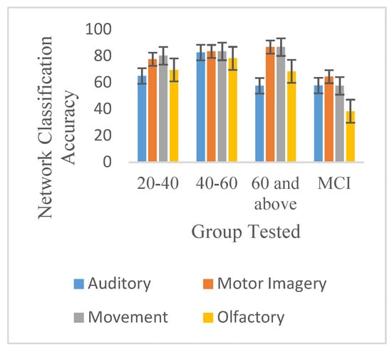 Discriminability of sensory motor potentials tested (auditory, olfactory, motor imagery, and movement) as defined by network classification accuracy (%) of the signals for test groups studied.