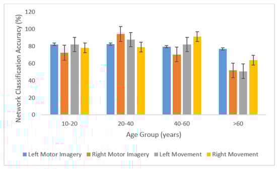 Discriminability of left and right movement and motor imagery as defined by network classification accuracy (%) of the signals for test groups studied.