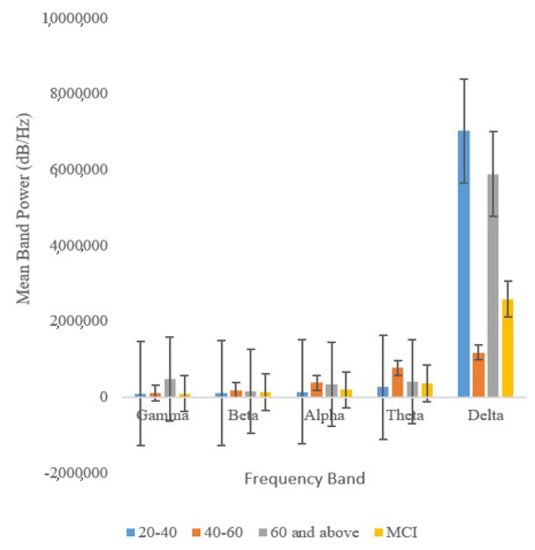 According to Figure 7, band power (dB/Hz) exhibits variation more frequently than network classification accuracy (%). This suggests that network classification accuracy is a more reliable indicator of cognitive deterioration than band power. Figure 8 indicates that the beta, alpha, theta, and gamma bands were the best indicators of cognitive aging and MCI.