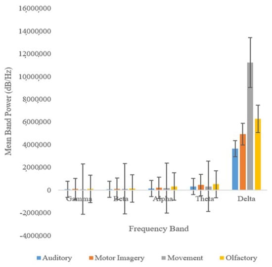 Mean band power (dB/Hz) of Gamma, Beta, Alpha, Theta, and Delta frequency bands elicited by auditory and olfactory stimuli, in addition to motor imagery and movement.