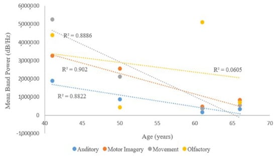 Relationship between mean band power (dB/Hz) of sensory motor potentials studied (auditory, olfactory, motor imagery, and movement) and subject age.