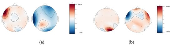 As shown in Table 5 and Table 6, the Fronto-parietal region, which processes sensory motor stimuli [], of MCI subjects was activated more often than those of healthy subjects, suggesting that the Fronto-parietal region is important in the advent of cognitive deterioration. Additionally, the pairs of topographical plots shown in Figure 10a,b show that the brains of MCI subjects display significantly lower activity levels in key regions (frontal, occipital, parietal, temporal) than those of healthy subjects. Based on the classification accuracies of EEG from sensory motor function tasks, it can be seen that the EEG features are not well discriminable in elder subjects and even lesser discriminable in subjects with MCI. Hence, sensory motor function tasks can be incorporated in early MCI diagnosis from fMRI modality, as well.