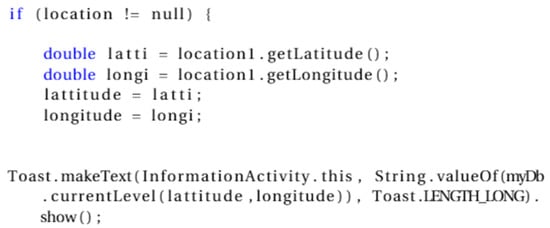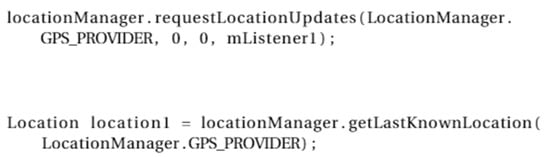 Figure 1. LocationManager class call. - getLocation—This function allows you first to access the device’s location (see Figure 2) through the coordinates of longitude and latitude obtained using the function currentLevel of the activity DataBaseHelper, the permission level of the location where the user is returned from the comparison with the existing locations in the database.