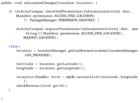 Figure 3. OnLocationChanged method. - currentLevel—This function aims to scroll through the table (using the Cursor class) that contains all location points given by longitude and latitude where access to application data is allowed. In turn, each location has an environment category and a maximum radius that delimits the access area. This function will receive the location of the device given by the getLocation function. In the currentLevel function, the distance function is called to calculate the distance. A comparison is made between the calculated distance, the user’s location, and the distance radius belonging to a given site, which is in the database. If this computed distance is less than or equal to the radius belonging to a location, the environment’s category level is returned. This level will be used by the onLocationChanged function, which will call the checkButtons function to determine the application layout change (see Figure 4).