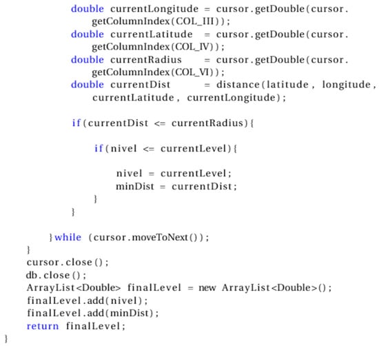 Figure 4. CurrentLevel method. - Distance—This function is auxiliary to the currentLevel function. Its main objective is to calculate the distance between a longitude and latitude coordinate point at which the user is and a coordinate point existing in the database, referring to a specific location.