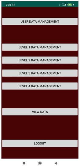 - Registration/Authentication: Users with varying levels of permission were created to test the functioning of the user registration/authentication. In the first attempt to register a new user, the field “name” was placed equal to that of an existing one in the database, and the application prevented registration. In the second attempt to register a new user, the “name” field was placed differently from an existing one in the database, and the application successfully registered. After the user was introduced, a user verification was performed in the database when the authentication attempt was made. In the first attempt, the user existed in the database, and the application saved the permission level, so the user was redirected to the activity corresponding to his permission level. In the second attempt, as the user’s existence in the database was not verified, he was prevented from entering any activity;