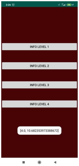 In Figure 8, the user was in a location with level 4, so four buttons for accessing information can be seen. It was also possible to view the distance to the location point defined in the database.