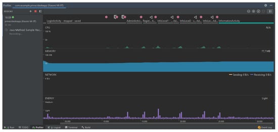 Android Profiler [38] was used to test the application’s performance. It is a tool for monitoring the real-time performance of the application provided by Android Studio [39]. This tool focuses on monitoring the application in the following aspects: