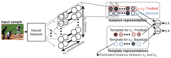 To get a better understanding of the setup, Figure 1 provides an example. For an input image showing a scene from a baseball game, a neural network learns a projection to a 2D representation. The amount of rows corresponds to the amount of classes and the amount of columns to the amount of environments. In this example, the first row corresponds to the label “Football”, and the second row corresponds to the label “Baseball”. Each of the environments , , … consists of a set of randomly selected labels; for example, could be constructed with the labels “Bat” and “Basketball”. The instance representation then gives an indication of how this image relates to these environments for each of the classes. The template representations give the average distance estimate between class and environments. For example, for the class (i.e., “Baseball”), the template would show a small distance with respect to as the notions “Baseball” and “Bat” are closely related. By comparing the values of the instance representation with the template representations, one can find that the second row of the instance representation (corresponding to “Baseball”) is highly similar to the template representation for “Baseball”. At the same time, the first row of the instance representation (corresponding to “Football”) is not that similar to the template representation for “Football”.