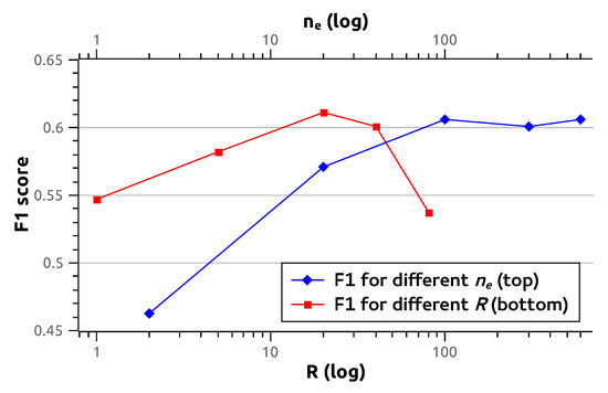 Influence of R and on the F1 score for multi-label image classification using the CoDiR (class) approach with ResNet-18. When modifying R, is fixed to 300. When modifying , R is fixed to 40. All data points are the average of three runs.Hyperparameters