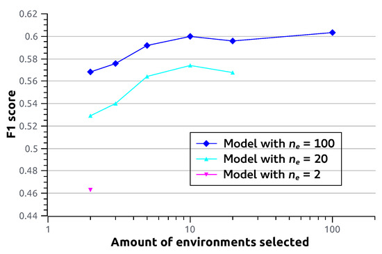 A concern might be that classification results with our method would be highly sensitive to the choice of random environments. However, it turns out that even when and R are small, the outcome is not sensitive with regard to the choice of environments, suggesting that the amount and diversity are more important than the composition of the environments. This is shown in Table 6 and Table 7, which give the standard deviations of the F1 scores for different values of and R, respectively. This raises some interesting questions about the importance of the selected environments. We investigate these questions further in the following subsections.