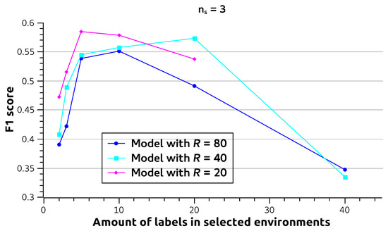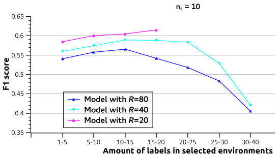 For R, the maximum amount of labels per environment, an optimal value can be found empirically between 0 and . Combining a large amount of labels in any environment evidently creates a unique subset for comparison with instances. When R is too large, however, subsets with unique features are no longer created, and performance deteriorates. In Figure 3, the influence of R on the F1 score for multi-label image classification is also shown.