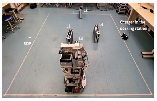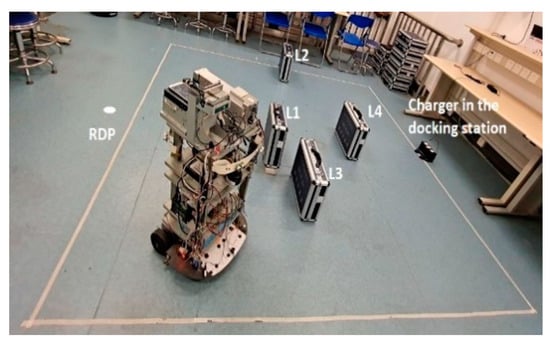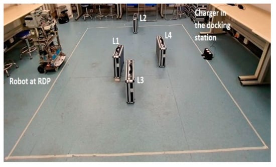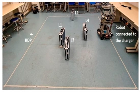 The role of these landmarks (L1, L2, L3 and L4) was twofold in this test space. First, they were used as references for the sensor measurement RPLIDAR-A3 scanner. Secondly, they interfered (to block) the broadcast IR signals from the charger to the robot. The robot departure position (RDP) was defined as the experiment starting position. From this RDP, the robot ran Algorithm 1 until finishing its docking operation. In addition to its infrared receiver (IRR), the robot was equipped with two encoders and one IMU module (smartphone-based sensor model) to provide Odometer and INS navigation data, respectively. These odometers provided wheel rotation rates, while the INS through the smartphone provided the acceleration force and the angular velocity to determine the robot’s orientation.