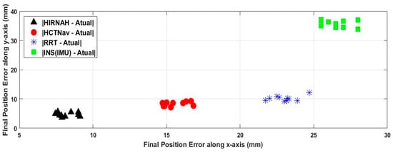 From Figure 6 and Figure 7 and Table 3, one can see that HIRNAH (the system when using NIRNA) provided more accurate positions and orientations, which was better than the system results when HCTNav, RRT or INS (IMU) were considered. In Figure 6, ten runs in each performance measurement of the robot’s final poses are shown. In this figure, HIRNAH was the best with the lowest errors on average along the x-axis (8.22 mm) and along the y-axis (4.64 mm), followed successively by HCTNav and RRT. For HCTNav, the average errors along the x-axis and y-axis were 15.60 mm and 8.31 mm, respectively. That was slightly better than those of RRT, which were 23.02 mm and 10.20 mm, respectively. Finally, the worst-case performance measurement was given by INS(IMU), with the more erroneous information, on average, 26.55 mm errors along the x-axis and 35.8 mm errors along the y-axis. In Figure 7, one can notice that HIRNAH presents the best performance measurement (in terms of the robot’s orientation errors for ten runs) with the lowest curve, followed successively by the curves for HCTNav, RRT and INS (IMU).