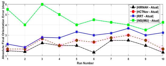 Throughout the ten experimental runs, HIRNAH provided less errors than the other performance measurements, except in run number four, where HIRNAH and HCTNav had the same errors. This is an exception which doesn’t appear often; otherwise (if it appears several times) it means the above supremacy of HIRNAH can be reversed under some conditions. Finally, the worst-case orientation errors of the robot were provided when the system used INS (IMU) in standalone mode.