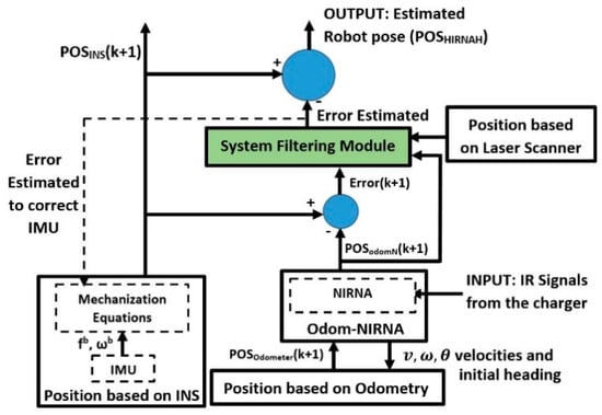 The build for HIRNAH is based on the principle of Kalman filters (KFs) for nonlinear systems, such as UKFs. This technique is a tight hybridization technique, which contains three hierarchical levels and thus provided a better robot state estimation. In the proposed system, each navigation system processes separately the robot state information and then, based on these results, the errors in the robot state are calculated. These state errors and the localization data from the RPLIDAR-A3 scanner (measurement unit) are used as inputs into the system filtering module (SFM) to produce the estimated errors of the robot state. Based on the obtained estimated errors, the robot’s optimal state estimation is calculated, which is much more accurate than the robot’s state estimation from some previous research.