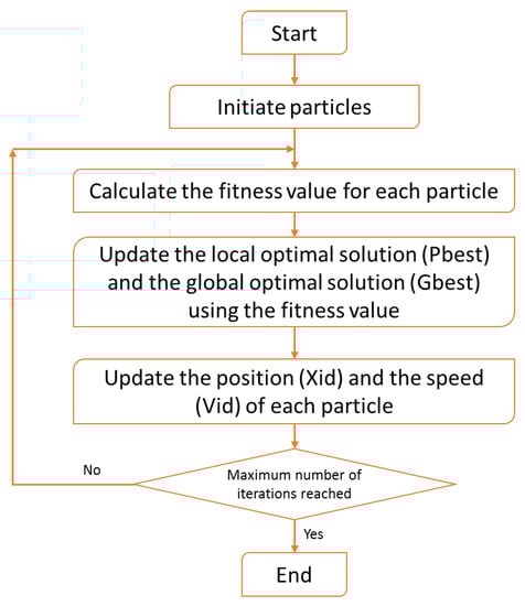 The position of each particle (Xid) is updated by Equation (1). The velocity of each particle (Vid) is updated by Equation (2):