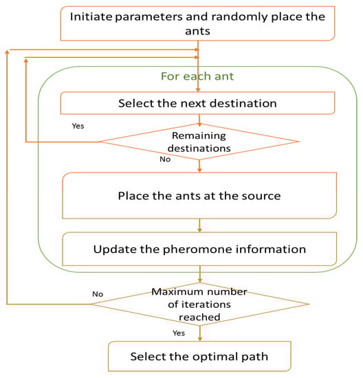 The ACO algorithm relies on a set of artificial ants that imitate the behavior of real-world ants by releasing an evaporated chemical substance called a pheromone to identify the shortest path between the nest and the food. The ants follow the path that has a higher pheromone concentration. The ACO, illustrated in Figure 2, is characterized by easy implementation and a strong global optimal ability, which makes it highly suitable for hybridization with other optimizers.