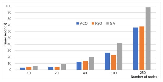 Convergence time of PSO, ACO, and the genetic algorithm (GA).