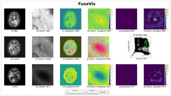 An overview of the FuseVis tool is shown in Figure 1 where the images related to the MRI are placed at the top row, the images related to PET at the bottom row whereas all the modality combining images are in the middle row. We placed input and fused images on the left, guidance images in the middle, and the jacobian images on the right side of the tool. The tool also consists of a dropdown menu to select the fusion method and two separate slider widgets, namely that represents to fix the gamma correction of the jacobian images and that represents to fix the gamma correction of the guidance images. The principle pixel can be chosen in any of the input images, guidance images, or the fused image using the mouseover operation. The user performs the mouseover interaction by pressing and holding the left button of the mouse and hovering around the image. While performing this operation, the current mouse cursor position defines the principle pixel coordinate and the local environment around the principle pixel is displayed in the zoomed-in versions of the images which is always placed to the right of the respective images. The local environment of the principle pixel is defined based on the red squared bounding box and the current principle pixel coordinate, i, is positioned around the center of the bounding box which is also shown as the red square in the zoomed images.
