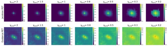 The first and second row shows the effect of the gamma correction on the jacobian PET and guidance PET images of MaskNet network with and varying between 0.1 and 2.0.