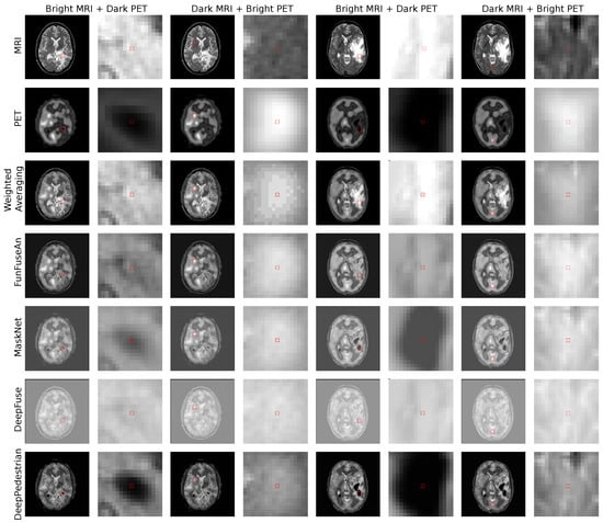 - A fusion approach should preserve the very bright PET features which convey high blood perfusion and normal metabolism in healthy brain tissues as it helps clinicians in visualizing the regions with high brain activity due to external stimuli at a particular time. For example, in the third and seventh column of Figure 4, the principal pixel in the bright PET region was chosen for visual analysis.