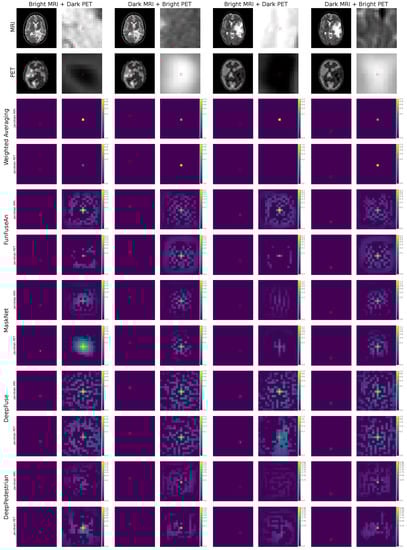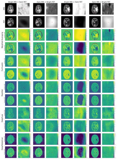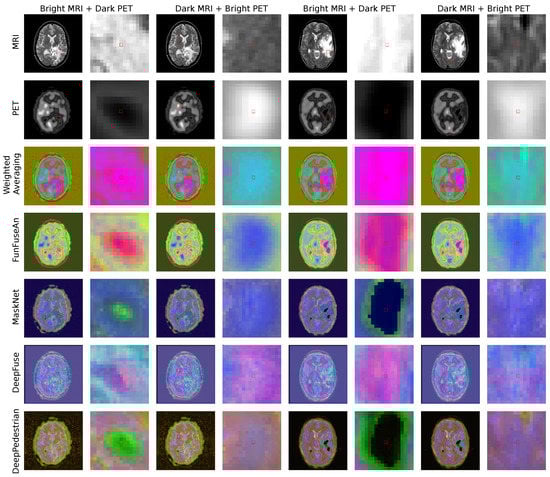 - A fusion approach should be stable and less sensitive to changes in input features from a clinically less significant modality. For example, the change in grayscale MRI intensities within the necrotic core shall not highly influence the fused grayscale intensities as it might corrupt the clinically important dark PET features. For example, the MaskNet and DeepPedestrian networks are less sensitive to changes in the MRI features which can be visualized in the guidance MRI and guidance PET images of these networks shown in Figure 5.