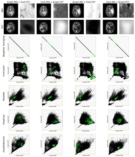 By examining the scatterplots for each of the fusion methods, no clear relationship between the guidance MRI and guidance PET images can be observed, except for the positive correlation between the low gradient values of guidance MRI and guidance PET images in the FunFuseAn and DeepFuse networks as well as a negative correlation between the gradients in the Weighted Averaging method. However, by looking at the gradients within the zoomed region of interests shown by green points, a correlation patterns for a few of the fusion networks can be determined. The scatterplot for Weighted Averaging shows a negative correlation between the guidance MRI and guidance PET images. Therefore, for bright MRI and dark PET intensity setups in each of the two test examples, higher gradient values in guidance MRI causes the green scatter points to tilt towards the higher end of the horizontal axis while for dark MRI and bright PET intensity setup in the two test examples, the scatter points tilt in the opposite direction. This behavior shows that an increase in the influence of one modality led to a decrease in the influence of the other and Weighted Averaging only prefers brightness as a feature which is clinically not interesting. The scatterplot of FunFuseAn shows a positive correlation between the lower gradient values of guidance MRI and guidance PET and there is no correlation between the other gradient values of guidance MRI and guidance PET images. However, by visualizing the green points for dark MRI and bright PET intensities, we can observe a positive correlation between the gradient values which means both input modalities equally influence the fused pixel in this region. For the bright MRI and dark PET intensity setup, the scatter points are distributed in such a way that gradients from guidance MRI are high and constant while the gradients from the guidance PET varies.