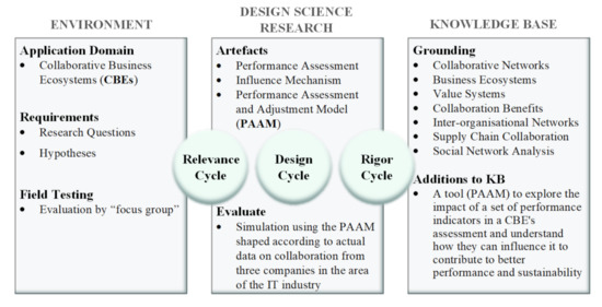 Taking into account our research goals of designing novel artefacts, we adopted the design science research (DSR) paradigm according to Hevner et al. [36], although there are other variants, such as the example in Peffers et al. [37]. The novel artefacts are a Performance Assessment, made of a set of performance indicators adequate to assess collaboration of the organisations in a CBE, and a simulation model, the PAAM, to support the performance indicators’ evaluation, which is expected to act as a factor of influence of the organisations, according to an Influence Mechanism, to improve their behaviour.