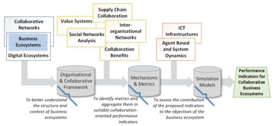 - The supply chain collaboration area identifies collaboration to improve performance in traditional supply chains (SC) and proposes a wide diversity of methods, metrics, and mechanisms from which [22,23,24,25,26,27,49,50,51,52] are relevant examples among many others. These contributions, although focusing on a different class of CNs, can be considered as a valuable input when it comes to establishing performance indicators for CBEs;