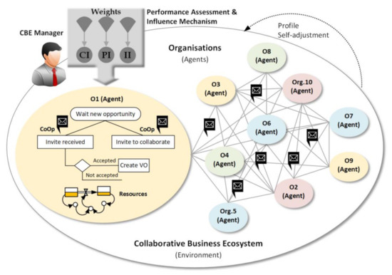The notion of CBE [3] results from a combination of Moore’s view [4], who first introduced the term business ecosystem, inspired by biological ecosystems, and the collaborative networks (CN) view, as presented in Camarinha-Matos and Afsarmanesh’s taxonomy of a CN [5,6], to highlight the collaboration facets of our view of a business ecosystem. Collaborative networks, when constituted by appropriate partners, will encourage knowledge and information sharing to strengthen products, processes, and market innovation, resulting in improved business performance [7]. An essential aspect in this context is the evaluation of the collaboration performance among organisations in the ecosystem to identify potential earnings and promote sustainability of the collaboration.