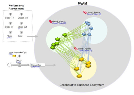 For the implementation of PAAM, we used AnyLogic tools [60] with simulation elements such as agent-based modelling (ABM) and system dynamics (SD). We used ABM for simulating the actions and interactions of the autonomous agents (representing the organisations) in the environment (the CBE) and SD to provide stocks and flows to manage the organisations’ resources. We also used discrete elements (statecharts, events, and timers) to combine the different techniques and models, to control state transitions, periods, or even capture exogenous values.
